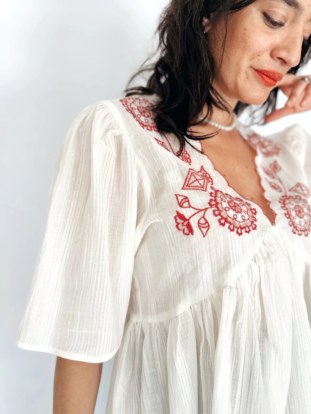 Es una prenda realizada en algodón con escote estilo V con detalles de onditas bordadas que continúa en un bordado central en la parte del pecho.