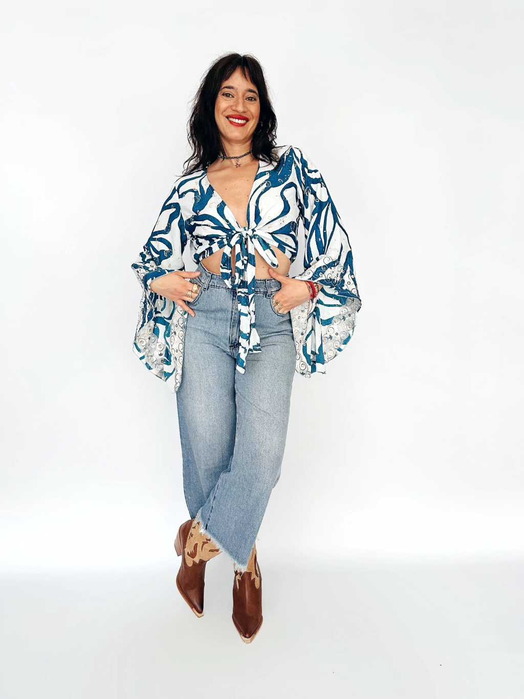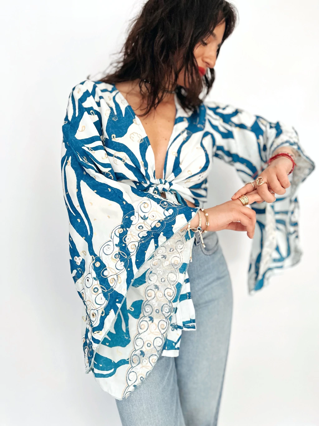 Sin dudas sus mangas amplias con terminación en pico se llevan todas las miradas y a eso le sumamos un delicado bordados con espejitos para darle ese detalle bohochic.