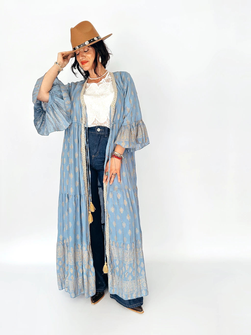 Podemos ver que la prenda es estampada con la técnica blockprint y combina con unos hilos en lurex dorados de forma vertical en toda la pieza haciendo del kimono Karnak una prenda distinguida y versátil.