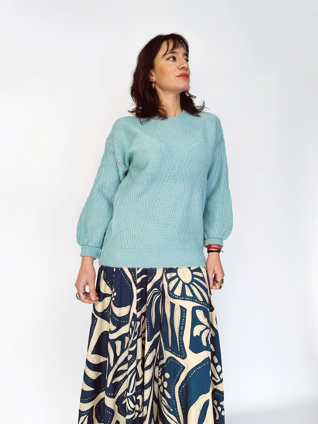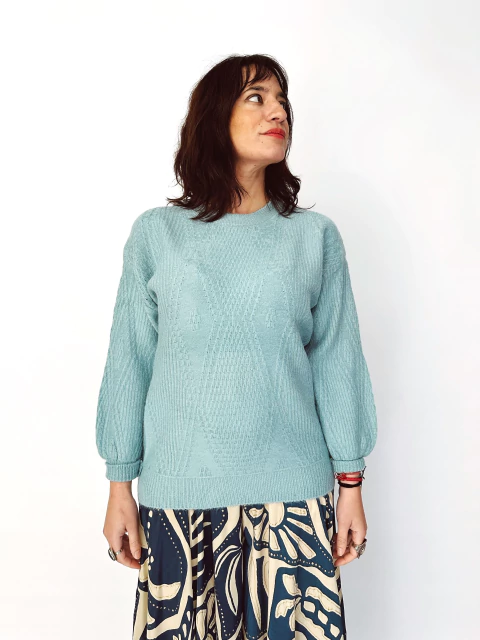 Sweater de cuello redondo realizado en lana mohair y elastano con rombos en frente, espalda y mangas.