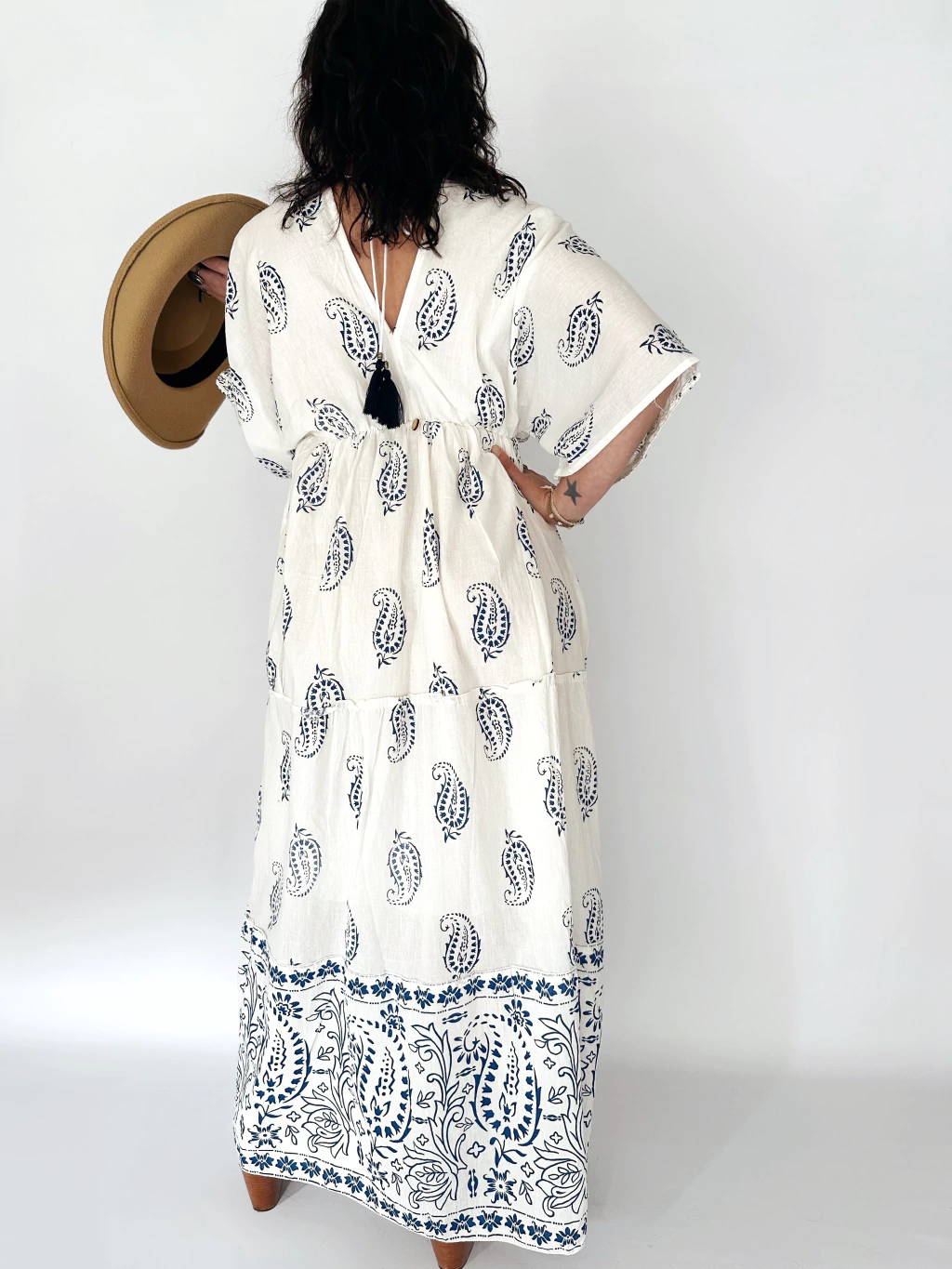 El vestido Tidore está confeccionado en algodón y estampado con la técnica blockprint donde artesanos indios utilizan sellos previamente tallados.